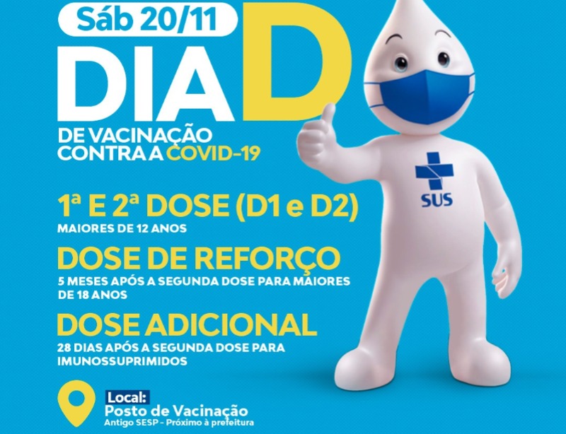 O dia D de imunização tem o objetivo de reforçar a campanha de imunização contra o novo coronavírus no público com 12 anos ou mais que ainda não recebeu a primeira dose e em pessoas que estão com a segunda dose em atraso.