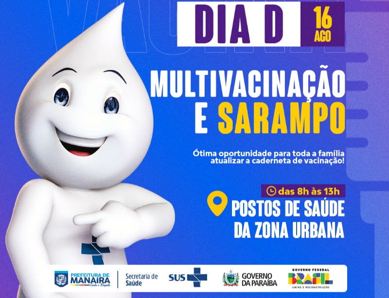 A Prefeitura de Manaíra promove, neste sábado (16), do dia D de multivacinação e sarampo. A mobilização será coordenada pela Secretaria de Saúde e tem o propósito de ampliar a cobertura vacinal contra o surgimento e a transmissão de doenças no município.