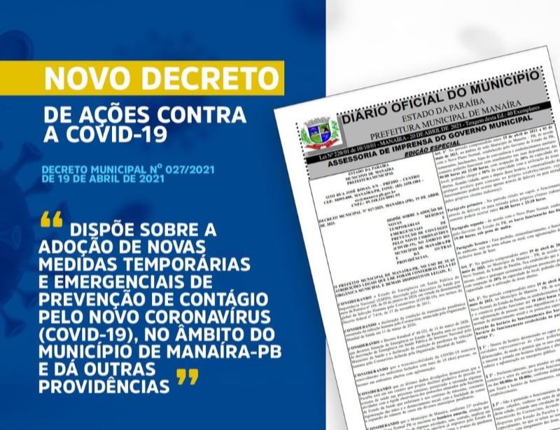 A Prefeitura de Manaíra publicou na segunda-feira (19) o Decreto nº 027/2021 que estabelece a adoção de novas medidas temporárias e emergenciais de prevenção ao contágio do novo coronavírus.