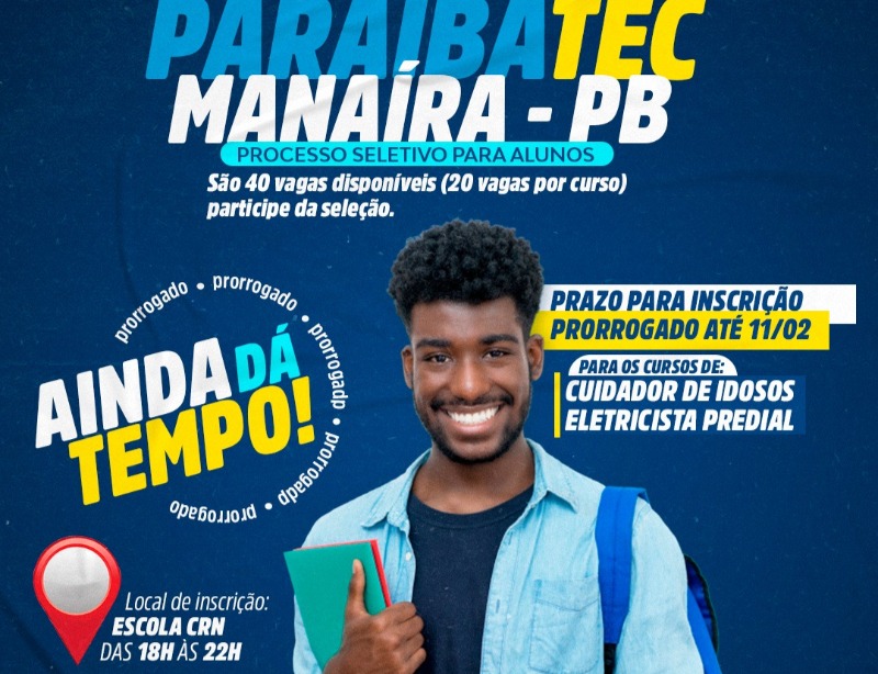 Encerra nessa sexta-feira (11) o período de inscrições para os cursos ofertados pelo Programa ParaíbaTEC na cidade de Manaíra.